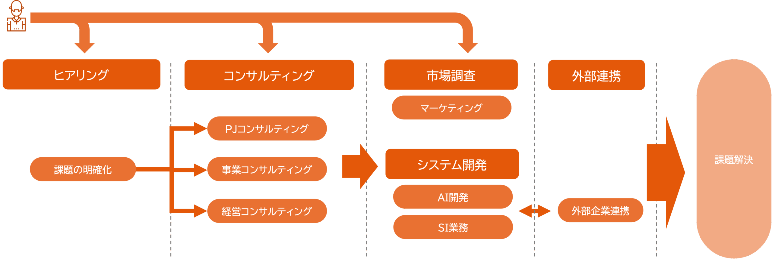 課題発見のための相談(ヒアリング)や課題解決に向けたコンサルティングはもちろん、販売拡大に向けたマーケティング戦略立案や、システム・AI開発を実施することができます。また、必要に応じて外部企業と連携し、柔軟に課題解決に向けた体制づくりを実施することも可能です。